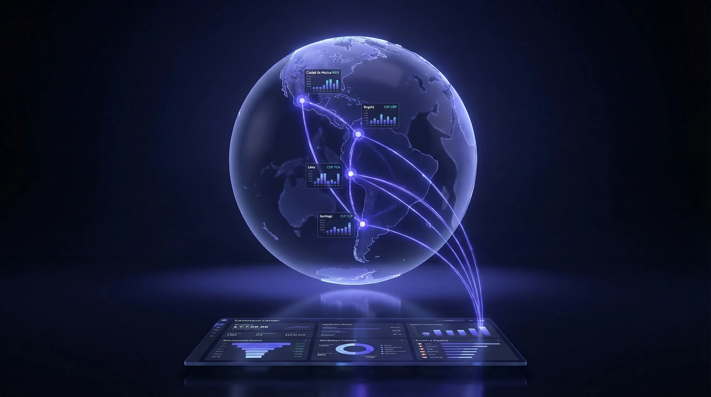 Arquitectura de Revenue Operations centralizada con conversión automática de divisas a USD corporativo. Filtrado automático de leads no cualificados antes de llegar al equipo de ventas. Trazabilidad completa de atribución: Marketing, Ventas, Referidos, Partners, Cross-selling regional. Catálogo unificado de productos y servicios para todos los países con análisis granular por línea de negocio.